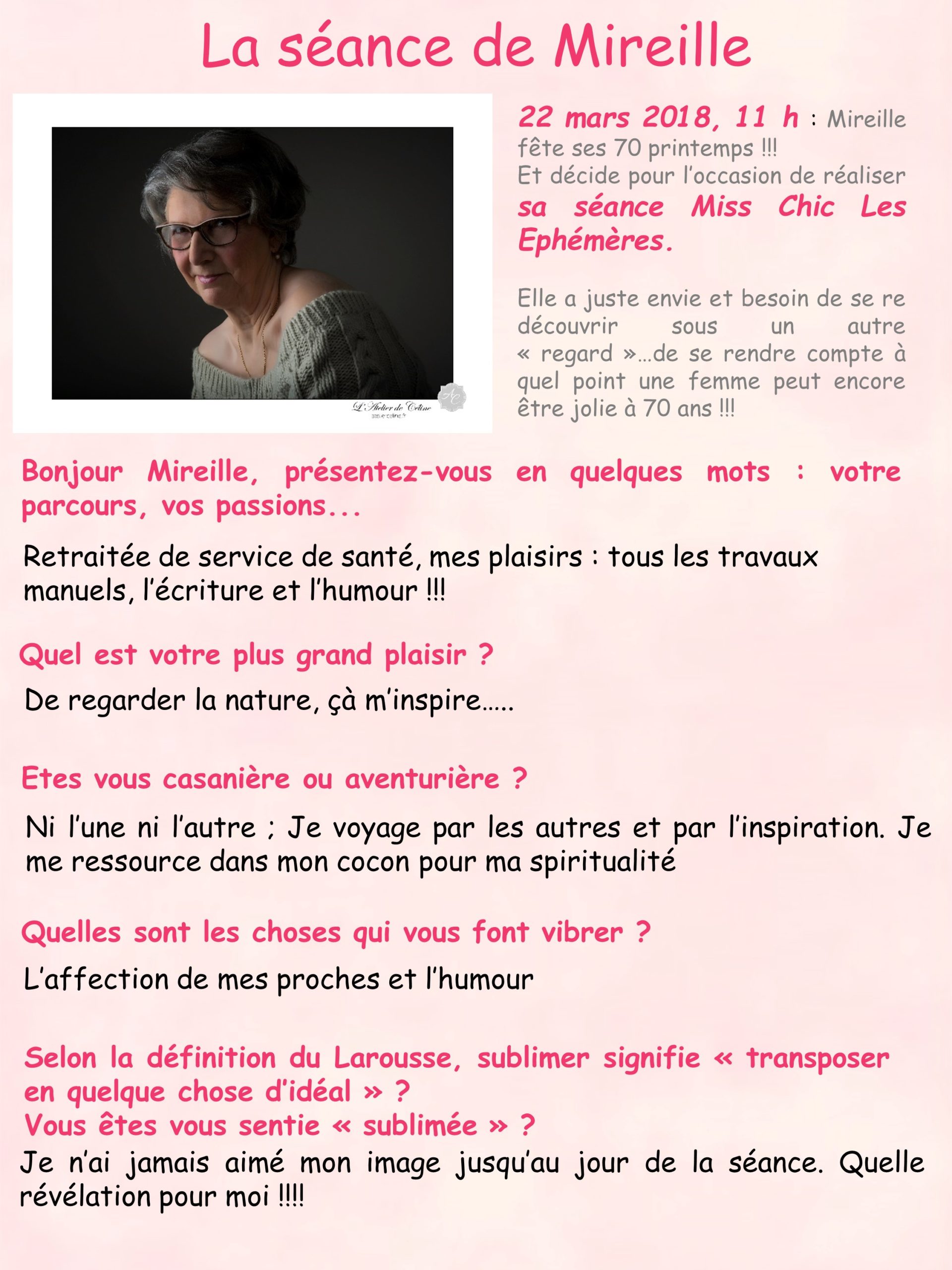 Amoureuse de la nature, des gens et de la vie en général, Mireille a choisi de fêter ses 70 ans en image en se lançant dans l’aventure des Ephémères….