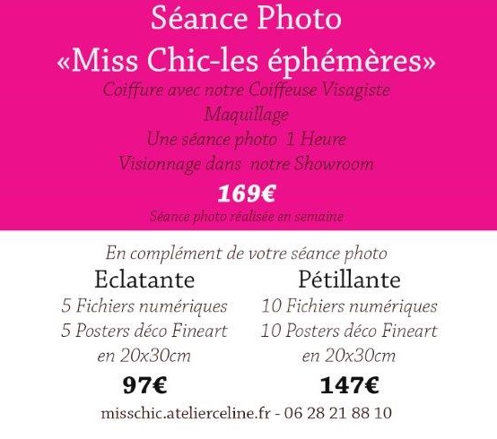 Parce que nous avons toutes besoin de nous retrouver en tant que femme, l’Atelier vous propose de venir tenter l’aventure avec la séance photo « les Éphémères » : à votre arrivée à l’Atelier, notre coiffeuse visagiste sera là pour vous coiffer, puis vous passerez sous les pinceaux de la maquilleuse avant de poursuivre avec une séance d’1 heure, pour seulement 169 €. A l’issue de la séance, nous vous donnons RDV quelques heures plus tard pour le visionnage de vos photos dans notre showroom avec deux offres exceptionnelles : Éclatante et Pétillante (description ci-dessous en image).
