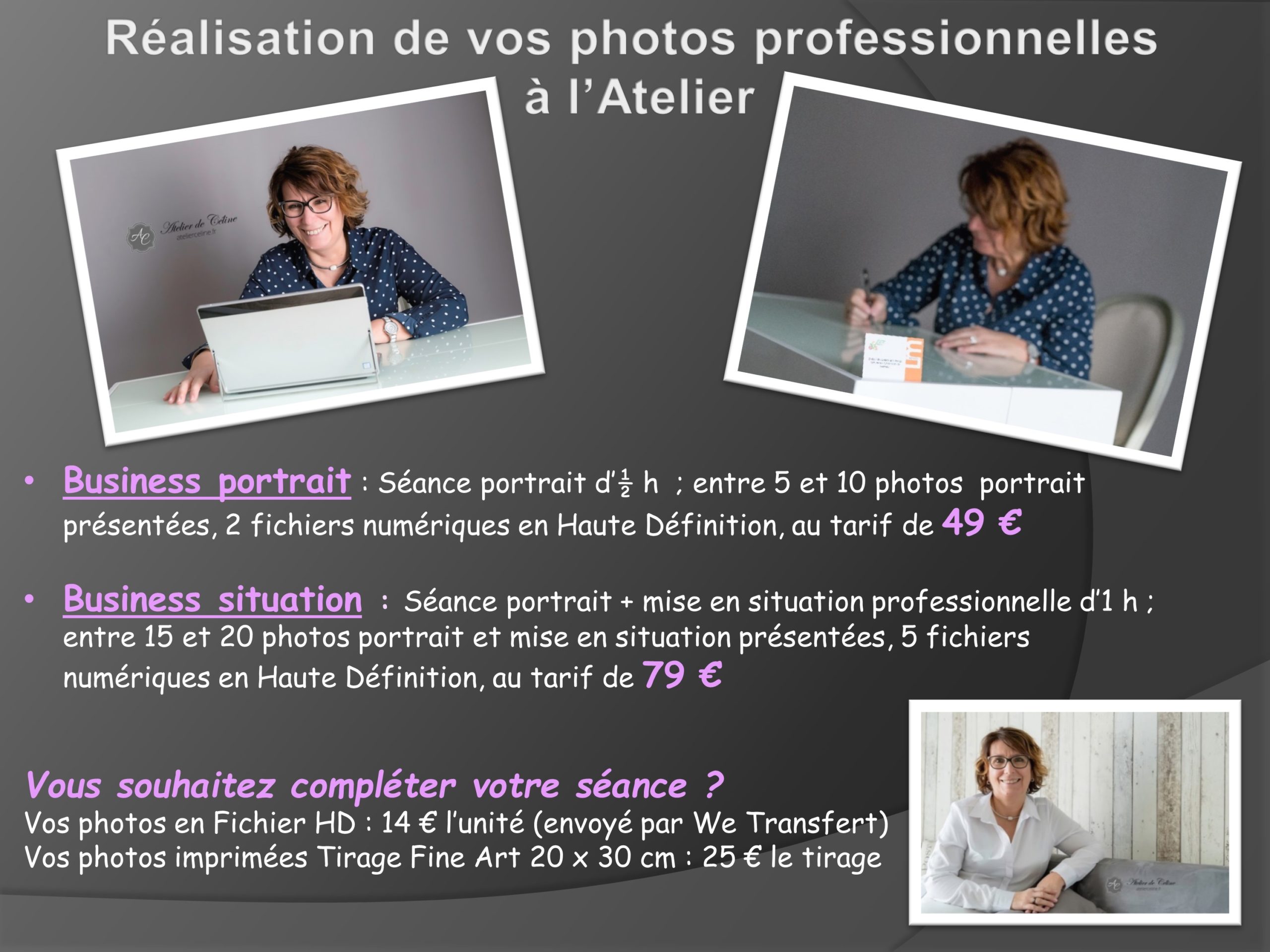 Trois formules au choix décrites ci-dessous que vous retrouverez également sur notre site :https://seance-photo.atelierceline.fr/photo-corporate.php